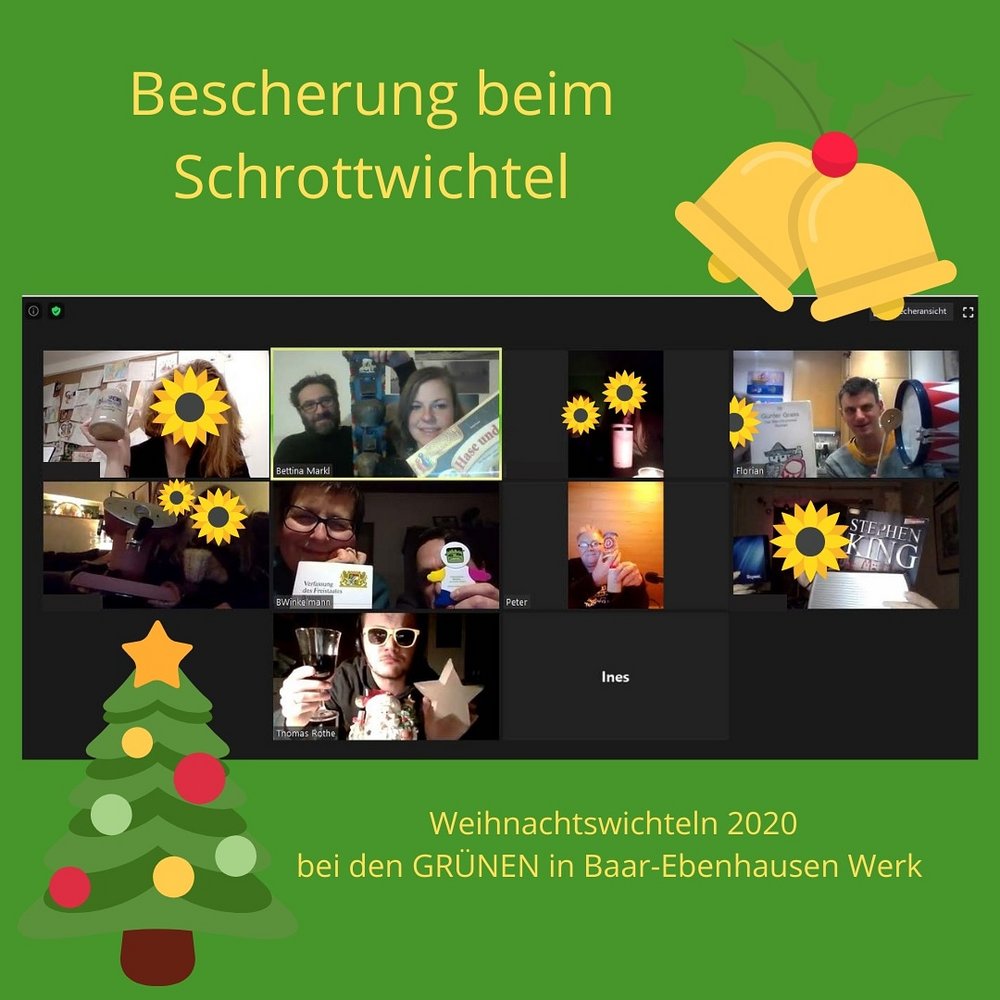 Sehr reale Geschenke wechselten am 19.12. beim ersten digitalen Weihnachtswichteln der GRÜNEN in Baar-Ebenhausen Werk ihre Besitzer. Die bayerische Verfassung, Frankensteins Monster,  Kuhglocken, Kaffeemaschinen, To Go Kaffeebecher, Gesellschaftsspiele und vieles mehr hatte der grüne Wichtel am Abend zuvor aus dem zentralen Geschenkelager im ganzen Ort an die Teilnehmer*innen verteilt. Dabei wusste niemand, von wem er beschenkt wird, das wurde erst bei der Bescherung aufgelöst. Einmal mehr wurde bewiesen, dass Schrott sehr subjektiv ist und häufig kam die erstaunte Frage auf: "Echt? Wieso brauchst du das nicht mehr?"