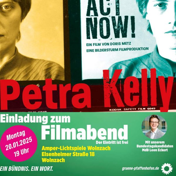 Die Grünen des Kreisverbandes Pfaffenhofen laden herzlich am 20.01.2025 um 19 Uhr zu einem Filmabend in die Amper-Lichtspiele nach Wolnzach ein. Der Eintritt ist frei! Gezeigt wird die Dokumentation über die Mitbegründerin der Grünen, Petra Kelly. Mit „PETRA KELLY – ACT NOW!“ wird eine politische Aktivistin porträtiert, die durch ihren Einsatz für Frauenrechte, Klimaschutz sowie ihre internationale Ausrichtung und Vernetzung eine Ausnahmeerscheinung war. Ihrer Zeit weit voraus, ist sie heute ein Vorbild für viele junge Menschen, die sich auch außerhalb des Politikbetriebs für die Rettung unseres Planeten engagieren.