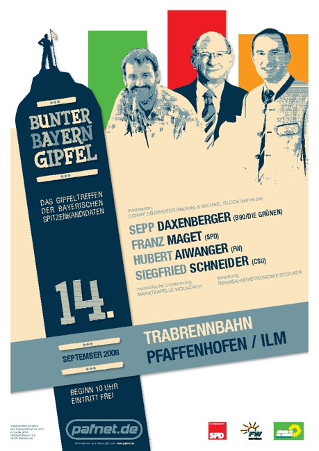 Vor dem Hintergrund der Landtagswahlen 08 veranstalteten die drei Pfaffenhofener Orts und Kreisverbände der Grünen, der Freien Wähler und der SPD am 14.09.2008 auf der Trabrennbahn den ersten „Bunten Bayern Gipfel“ - ein in Bayern bisdahin einmaliges Gipfeltreffen.