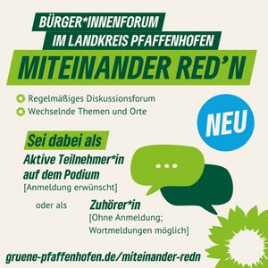 Der Kreisverband Bündnis 90 / Die Grünen lädt zu miteinander reden und mitreden ein und veranstaltet regelmäßig Diskussionsforen im ganzen Landkreis bei denen Bürger*innen mit ihren Anliegen auch auf das Podium eingeladen sind. Die Themen und Orte wechseln, ebenso wie die Diskussionsteilnehmer*innen. Eines ist immer gleich: Bürger*innen können sich im Vorfeld zur Diskussionsteilnahme anmelden. Die Teilnahme an der Diskussion kann dann je nach Anliegen, Wunsch und Andrang weiterer Teilnehmender länger oder kürzer ausfallen. Es ist auch möglich das Anliegen durch die Moderation vorbringen zu lassen.