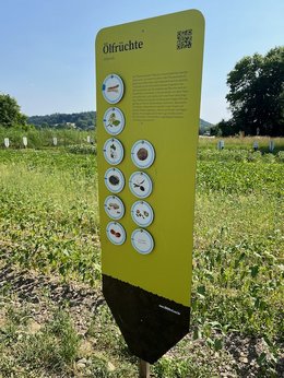 Die einzelnen Feldabschnitte sind mit Erklärungstafeln beschildert, die Wissenswertes über die Nutzung der Pflanzen geben, deren weltweiter Anteil an Ackerfläche oder auch erklären warum man eine Ersatzpflanze wie beim Reis angebaut hat.