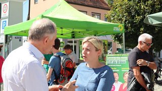 Was in lockerer gelöster Atmosphäre begann, endete in einem Pfeifkonzert einer Gruppe Querdenker*innen. Teilweise waren Bürger*innen aus vielen Ecken des Landkreises angereist, um die Spitzenkandidatin persönlich zu treffen und ihr konstruktive Fragen zu stellen. Auch die beiden Direktkandidaten Sebastian Seitz (Bezirkstag) und Roland Dörfler (Landtag) und ihre Kolleg*innen auf den jeweiligen Listen Bettina Markl für den Landtag und Richard Zeitler für den Bezirkstag, fanden sich sehr schnell in angeregten Gesprächen wieder. Während Sebastian Seitz an einer Ecke informierte: "Wir müssen die häusliche Pflege stärken und Angehörige besser unterstützen und entlasten! Das Angebot an Tages- und Kurzzeitpflegeplätzen muss vor allem im ländlichen Raum deutlich vergrößert werden“, befasste sich Roland Dörfler mit der Energiepolitik der bayerischen Landesregierung. „Söder verspricht 1000 Windräder in Bayern. In den ersten acht Monaten sind jedoch nur vier Windräder genehmigt worden, davon drei in Pfaffenhofen bei einer Genehmigungszeit von sechs Jahren. Wenn es in diesem Tempo weitergeht dann dauert es über 200 Jahre. Außer Dampfplauderei kommt von Söder nichts...“, hört man den zweiten Bürgermeister von Pfaffenhofen über seine praktischen Erfahrungen in Sachen Energiewende reden.