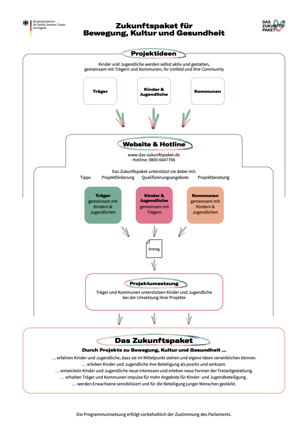 Das Ziel des Programms ist es, Kindern und Jugendlichen Raum für Teilhabe und Engagement zu geben und den psychischen Belastungen der letzten Jahre entgegen zu wirken. Es geht um kulturelle Bildung, Gesundheit und Zusammenhalt. Konkret kann das Geld z.B. für Festivals, Aufführungen, Sportturniere, Freizeiten oder Begegnungsräume verwendet werden. Dabei sind Personal- und Sachausgaben förderfähig. Wer Inspirationen für mögliche Projekte sucht, findet diese und weitere Informationen auf www.das-zukunftspaket.de.