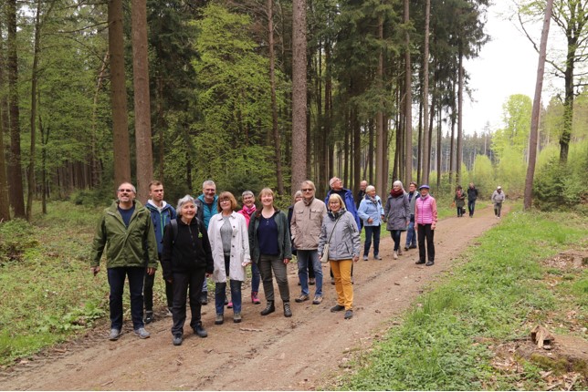 Am Treffpunkt im Frauenholz angekommen, wurde die Gruppe von Förster Jakob Kürzinger in Empfang genommen. Kürzinger, der schon in seiner aktiven beruflichen Zeit seit 1979 für diesen zum Pfarrverband Fahrenzhausen-Haimhausen gehörenden Kirchenwald Inhausen zuständig war und ihn seit seiner Pensionierung 2015 im Rahmen eines Waldpflegevertrages weiter betreut, zeigte sich erfreut über die große Teilnehmerzahl und das Interesse. Der knapp 50 Hektar große Wald geht auf das Vermächtnis zweier adliger Damen zurück - neben weiteren Vermögensübereignungen an die Filialkirche Maria Himmelfahrt das sogenannte Benefizium aus dem Jahr 1457 - und ist noch heute im Eigentum der Filialkirchenstiftung Inhausen. In diesem Zusammenhang erfuhren die Teilnehmer auch, dass in Bayern über 55 Prozent der Waldfläche in Privateigentum sind; im Durchschnitt halten die rund 700.000 privaten Waldbesitzer nicht mehr als zwei Hektar Fläche und genießen große Freiheit bei der Bewirtschaftung.