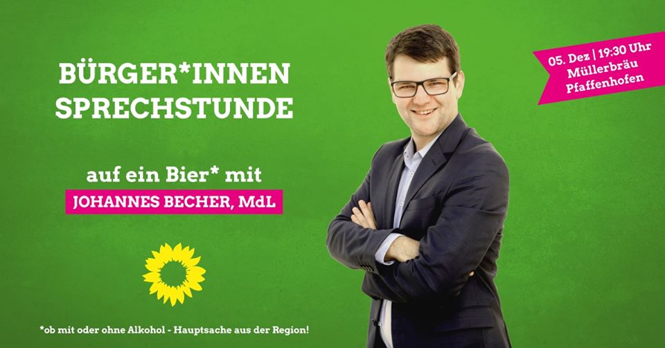 Am 05. Dezember 2019, lädt Johannes Becher zwischen 19 und 22 Uhr zur Bürger*innen-Sprechstunde im Müllerbräu, Hauptplatz 2, Pfaffenhofen ein. Interessierte sind herzlich eingeladen, mit Anregungen und zum ungezwungenen Austausch vorbeizukommen. Johannes Becher freut sich auf guten Kontakt und anregenden Gespräche.