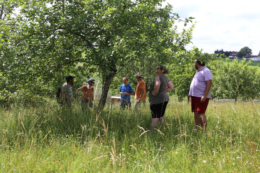 Als zweites Ziel wurde in Hilgertshausen die sogenannte Bürgermeister-Wiese angesteuert. Georg Salvamoser klärte auf, wie die Blühwiese zu ihrem Namen gekommen ist: Bürgermeister aus der ganzen Umgebung haben hier vor Jahren zusammen je einen Obstbaum gepflanzt. Die Streuobstwiese wird einmal pro Jahr gemäht und das Mähgut von Hand abgetragen.