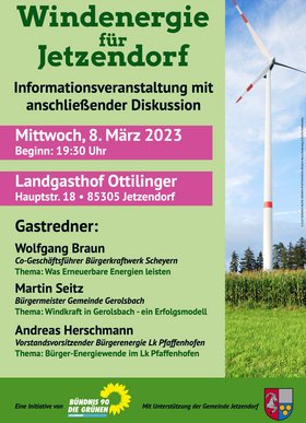 Der Ortsverband Grüne/ Bündnis 90 Jetzendorf lädt am 08. März, 19:30h im Gasthaus Ottilinger (Hauptstraße 18, 85305 Jetzendorf) ein um über Windenergie in der Gemeinde Jetzendorf zu informieren. Wolfgang Braun, Beisitzer im Kreisvorstand Grüne Pfaffenhofen und Co-Geschäftsführer BKW Scheyern, wird verdeutlichen, was Erneuerbare Energien bereits heute leisten und warum für die zukünftig erwarteten Strombedarfe Windenergie unverzichtbar sein wird. Der Gerolsbacher Bürgermeister Martin Seitz kann aus erster Hand über das erfolgreiche Windenergieprojekt in seiner Kommune berichten. Welche Chancen sich für die Bürger:innen beim Umbau hin zu einer nachhaltigen und dezentralen Energieversorgung mit Windenergie eröffnen, wird Andreas Herschmann, Vorsitzender der BEG Pfaffenhofen, vorstellen.