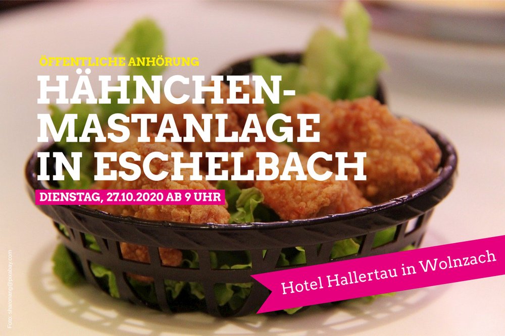 Am Dienstag, den 27.10.2020 ab 9 Uhr werden Vertreter des Landratsamtes und verschiedener Fachstellen im Hotel Hallertau in Wolnzach auf Kritik eingehen zur Vergrößerung der Hähnchenmastanlage in Eschelbach eingehen. Die Veranstaltung ist zwar vor allem für die Personen und Verbände gedacht, die schriftlich Einwände vorgebracht haben, aber trotzdem können alle Interessierten teilnehmen.