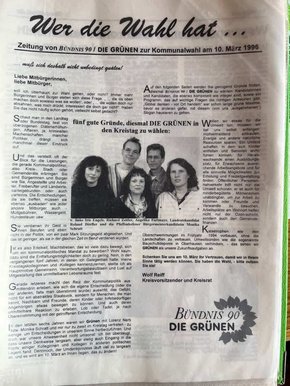 Ein besonderer Moment des Abends war der Rückblick von Richard Zeitler, Gründungsmitglied, ehemaliger Vorsitzender und Gemeinderat der Wolnzacher Grünen. Mit alten Zeitungsausschnitten; Wahlflyern, den Themenblättern zu Kommunalwahl 1986 ließ er die Anfangsjahre lebendig werden.