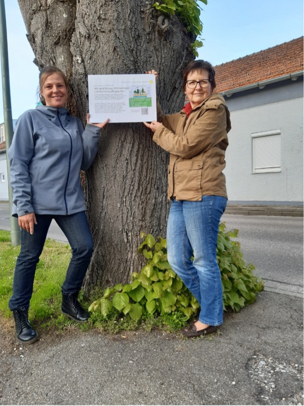 Bildunterschrift: Eine der Stationen des "Spaziergangs zum Tag der Biodiversität" werden vier alte Linden in der Werkstraße sein, die für das Areal nicht nur Zeitzeugen und prägende Ortsbäume, sondern auch Biotope sind. Bettina Markl (li.) und Brigitta Winkelmann vom Ortverband Bündnis 90 / DIE GRÜNEN positionieren schon mal die Infotafel.