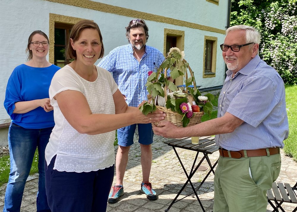 Damit hatte dieser erste Teil der Vorstandswahl einen erfreulichen Verlauf genommen und konnte zügig beendet werden. Wie es sich aber für eine ordentliche Wahl gehört, fand am Samstag, den 12.06.2021, noch der Urnenwahlgang statt: natürlich corona-konform und im Freien. Und mit Besuch von dem tatsächlich aus Eching heran geradelten Leon Eckert und unserem treuen Wahlleiter Wilhelm Reim. Der beste Rahmen für den neuen Vorstand, um Helmut Schnapp als Dank noch einen Geschenkkorb mit feinen Schmankerln aus dem Biokammerl Geisenhofer in Reichertshausen zu überreichen.