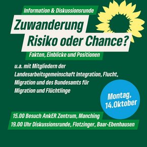 Um Fakten, Einblicke und Positionen geht es am Montag, 14. Oktober im Info- und Diskussionsabend "Zuwanderung: Risiko oder Chance?" im Landgasthof Flotzinger, Münchner Str. 21, Baar-Ebenhausen ab 19 Uhr. Hierzu lädt der Kreisverband Pfaffenhofen von Bündnis 90 / Die Grünen gemeinsam mit dem Ortsverband Baar-Ebenhausen und der Landesarbeitsgemeinschaft Integration, Flucht, Migration. Wer Diskussionsbeiträge oder Fragen stellen will sendet diese über dieses Formular vorab.