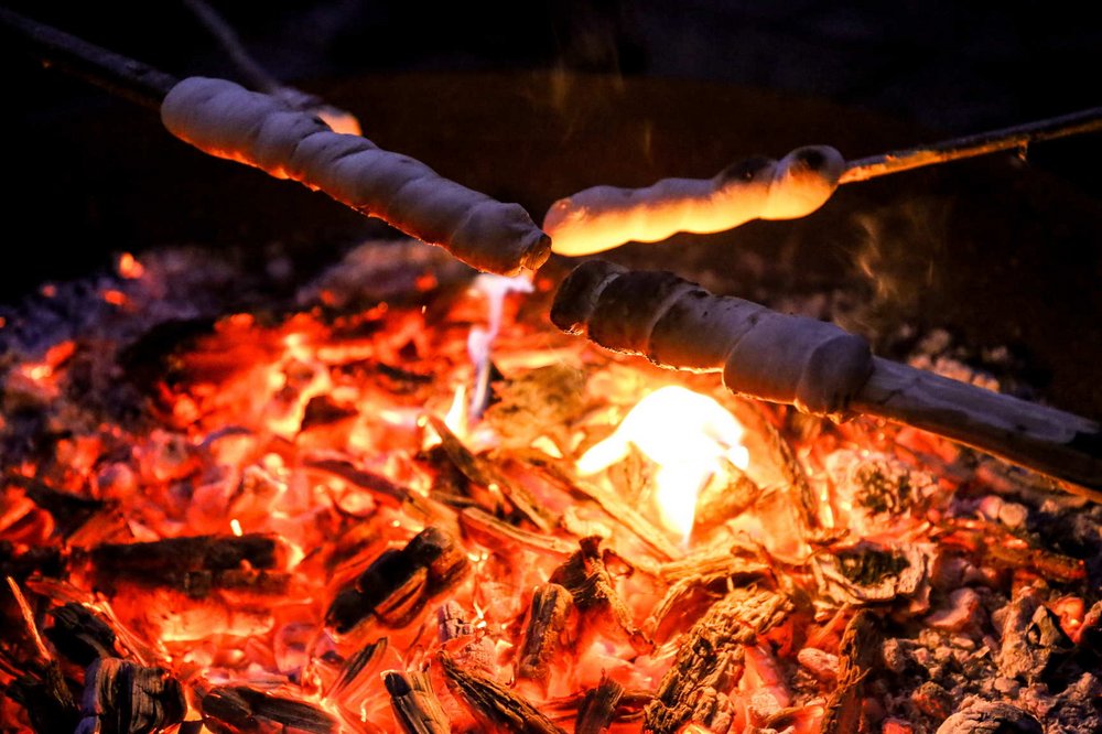 Und mit genau solchem Schwung wurden dann im Anschluss fast vier Kilo Stockbrot um die vorbereiteten Stöcke gewickelt und mit mehr oder weniger Hilfe der elterlichen Hände auch geduldig über der Glut gebacken.