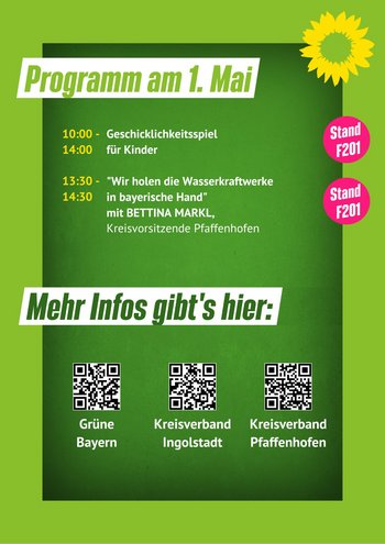 Die Kreisverbände Pfaffenhofen und Ingolstadt sind von Freitag, 28.April bis Montag, 1. Mai, 10 - 18 Uhr mit einem Stand und Vortragsprogramm auf der Gewerbemesse Manching vertreten. Highlight der Messe aus grüner Sicht ist der Besuch von Katha Schulze am Sonntag, 30. April. Sie wird ab 11 Uhr Teilnehmerin an der Gesprächsrunde Nachhaltigkeit sein, anschließend einen Rundgang über die Messe mit den Kandidat*innen der Landtags- und Bezirkstagswahlen 2023 durchführen und abschließend von 13.30 bis 14.30 am Stand für Gespräche zur Verfügung stehen. Der Stand der beiden Kreisverbände befindet sich auf dem Freigelände, Nummer F201, Gartenmarkt. Auch Bundestagsabgeordneter Leon Eckert hat sich am Sonntag angekündigt und wird unter anderem einen Vortrag zu "Steuerverschwendung im Verkehrsministerium - Einblicke aus dem Rechnungsprüfungsausschuss des Deutschen Bundestages" halten. Vorträge und Gespräche zu breiten Themen von Elektromobilität, Stromversorgungssicherheit, Ausbau B16, Pflege oder Wasserkraft gibt es von und mit den Landtags- und Bezirkstagskandidat*innen der Stimmkreise Pfaffenhofen und Ingolstadt, Vertreter*innen der Kreisverbände und des Ortsverbandes Geisenfeld-Manching.